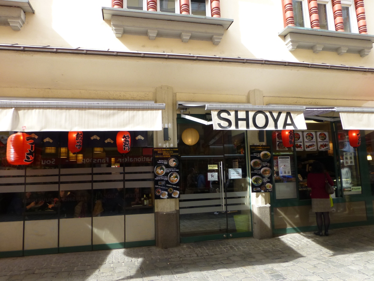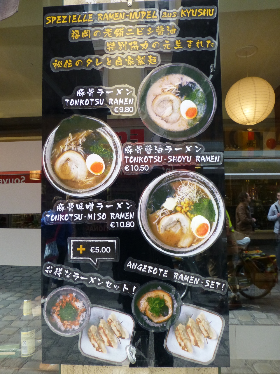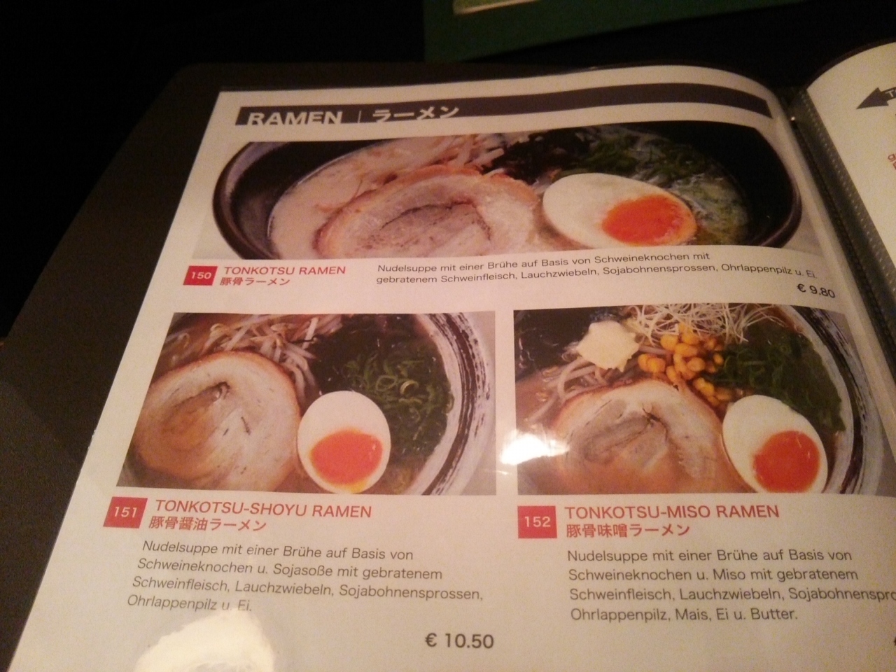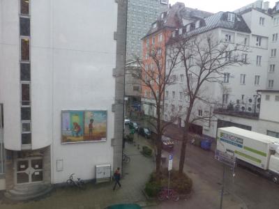 ルフトハンザバス降りたら路面電車の走る道を渡って付き当たり左に曲がればすぐ右側に派手な壁紙に入ります。