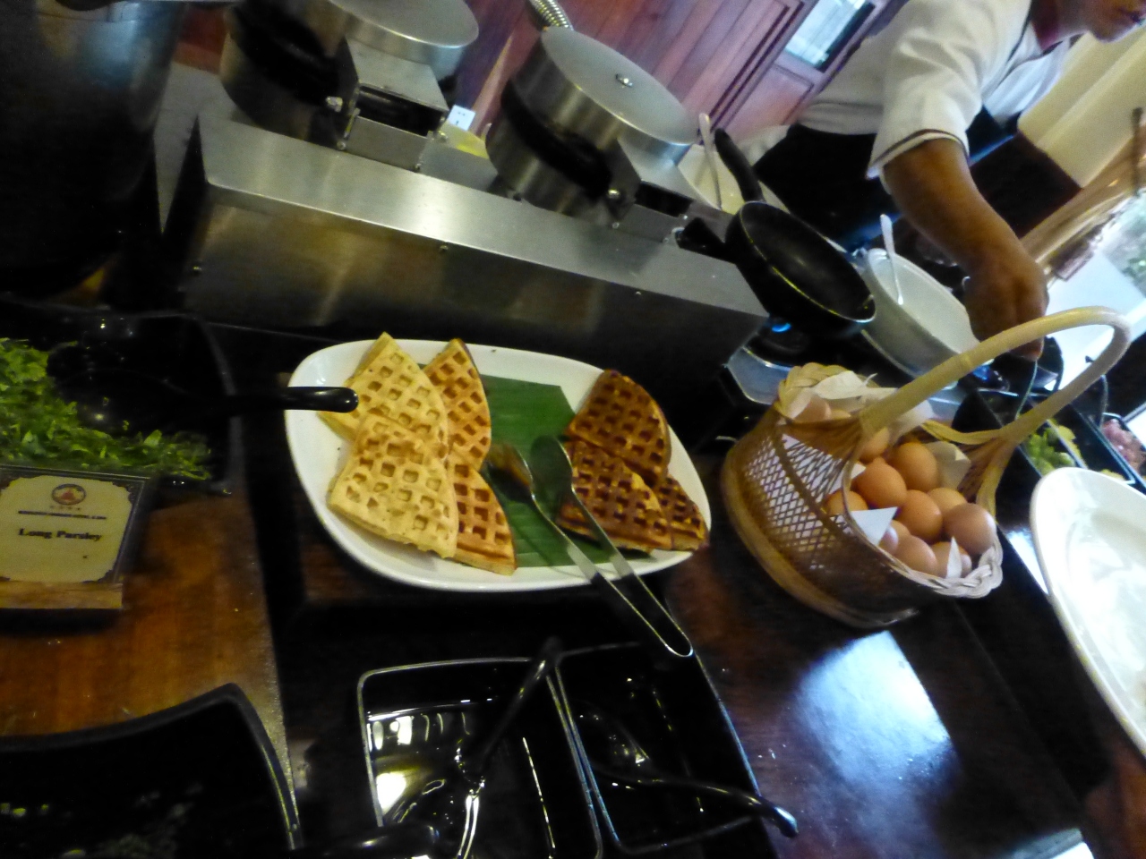 1階にて無料の朝食あり。入店時にルームナンバー聞かれる事もあります。メニュー豊富でオープンキッチンでお好みの卵料理やホー麵・ワッフルあり。
