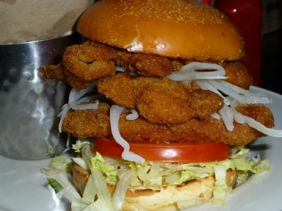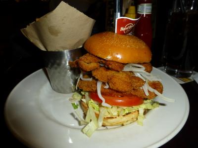 スライスオニオン・トマト・レタス、ビーフパテはなくチキンフライが5枚位挟んである! ハンバーガーとは呼びにくいかな??