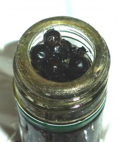 全長7cmほどの小瓶に枝つきの状態の胡椒の実が何かに漬かってる。