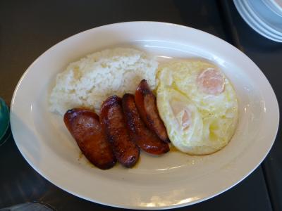 ●Portuguese Sausage & Eggs(¥1150)のポルトガルソーセージって初めて食べたが、思った以上にスパイシーで子供向きではないです。付け合わせはライス(日本のご飯でした)