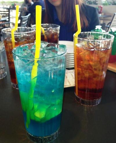 ドリンクはソフトドリンクを各チョイス(¥350~¥550)。友人のオーダーしたレモネードがトロピカルカラー!一口飲んだがレモン弱い…
