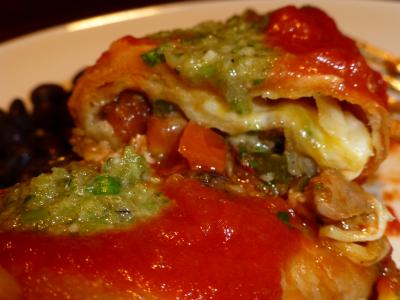 燻製したハラペーニョやクミンなどで味付けしたアメリカ南部風のチキンを、トルティーヤで包んで揚げ、その上にチーズをのせて焼き上げ、トマトソースとフレッシュなハラペーニョで作ったサルサをトッピングしたメキシコ風アメリカ料理って事ですが、