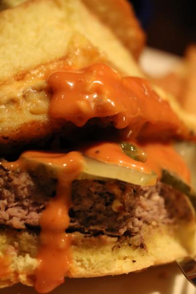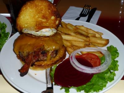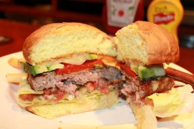 グリルしたリンゴ・ソテーオニオン・ベーコン・モントレージャックチーズが240gのビーフパテを使用したレジェンダリーハンバーガーにはさんであるのですが、