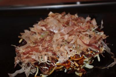 「モダン焼き」個人的にどこのお好み焼屋に行ってもほぼ毎回食べるメニュー。運ばれて来ると踊る花かつおが食欲をそそります!切り分け時にコテに鰹節がへばり付くのは御愛嬌?味も問題なく万人受けすると思います。