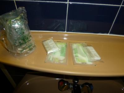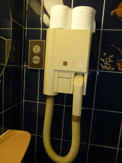 バスタオルのみでフェイスタオルなどなし。アミティは固形石鹸1個と袋入りシャンプーのみ。壁に固定のホース式ドライヤーあるが、少しホース臭い温風。