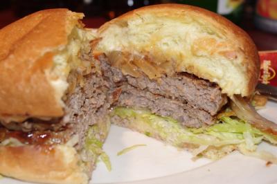 150gのパテ3枚で450g……クラッシックバーガーのパテが180gでレジャンダリーバーガーのパテが240g