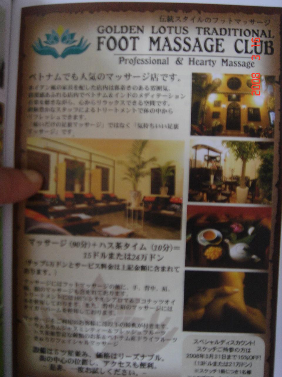 ホイアン風の家具を配した店内は、落ち着きある雰囲気です。清潔感あふれる店内でベトナム&インドのメディテーション音楽を聴きながら、心からリラックスできる空間があります。 マッサージ(90分)+ハス茶タイム(10分)で15ドルまたは、24万ドン(チップ込)ぼくは、時間がなかったので、60分 12ドルで足と肩のマッサージをしてもらいました。空港では、30分で30ドル〜ですので、とってもお得! 連絡先は、1号店:20 Thi Sach St. D.1 HCMC / 2号店: 18 Ho Huan Nghiep St.. D.1 TEL: 08-829-6400 (日本語可能)Open:10:00−24:00- 旅行時期