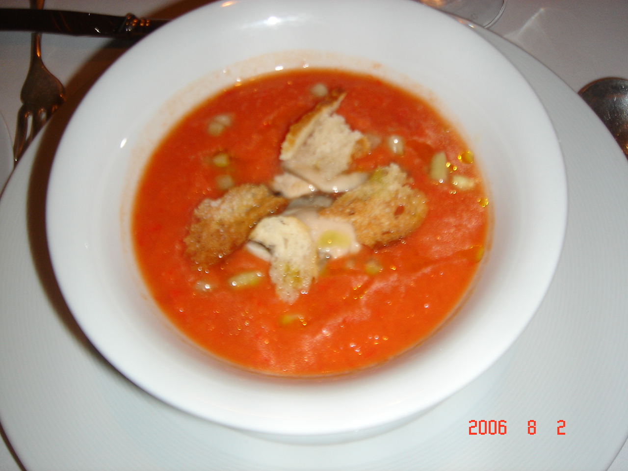 今日は日本からのお客さんの対応でこの店に! なにより生牡蠣が美味しかった! ごめんなさい。生牡蠣を写真にとること 忘れてしまいました。 それほど おいしかったのです。 ここは、ロンドン リージェントストリートより少し南に入ったところです。平均予算は、£75ぐらいでしょうか? この写真は、生牡蠣入り ガスパチョ(冷たいスペイン風スープ)です。