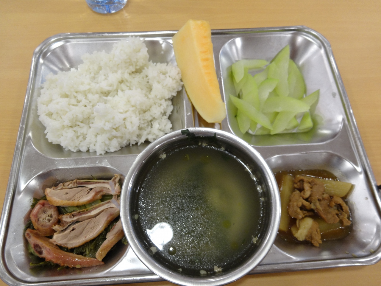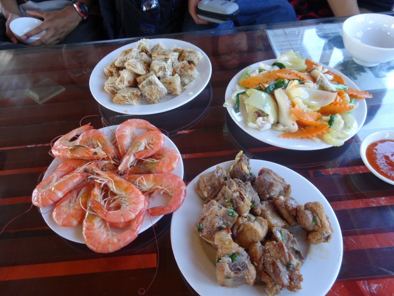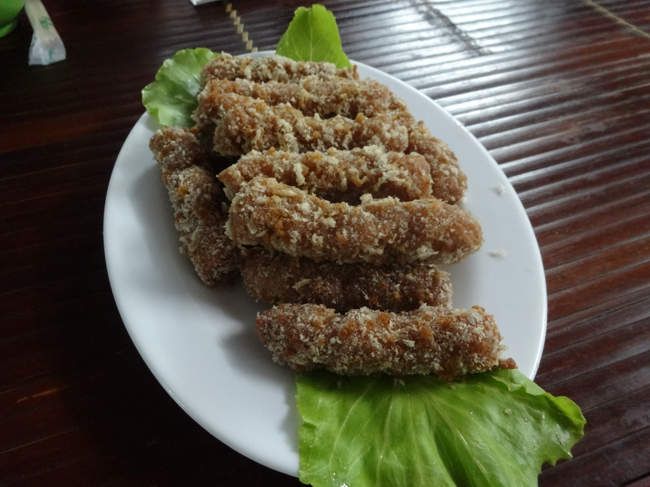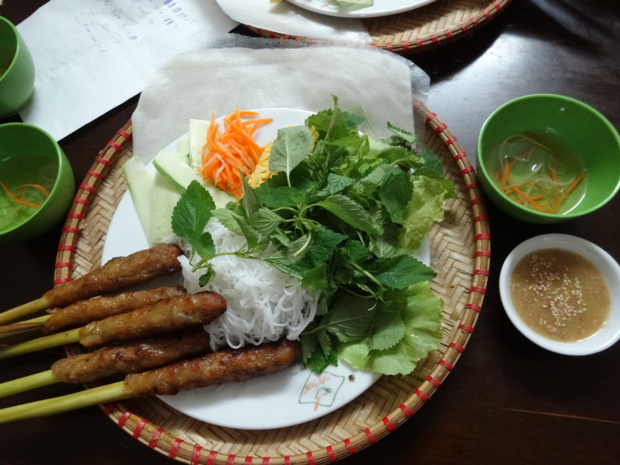ライスペーパーにお肉や野菜、果物などを自分でくるんで、酢のようなサッパリしたたれをつけて食べました。生野菜があったのでお腹を壊さないか心配でしたが問題ありませんでした。ライスペーパーの量が多かったので、具材を調節しないと最後にライスペーパーだけが残ってしまいました。