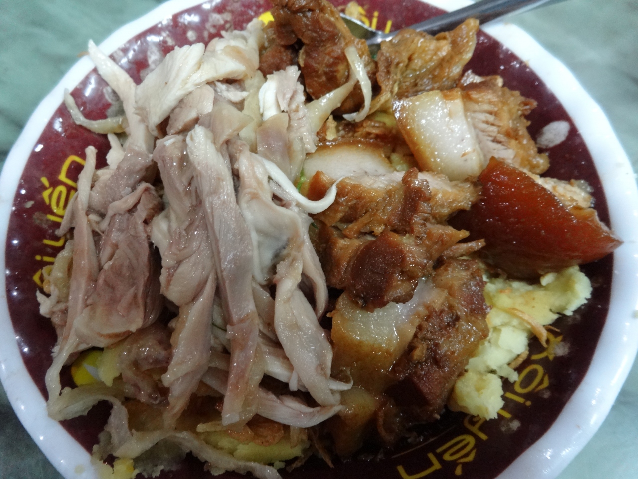 お茶碗位の小さな器に入っていたので最初は少ないと思いましたが、最後まで食べてみると不思議とお腹いっぱいになりました。鶏肉と豚肉がたくさん載っていて、少し脂っこかったですがご飯が進む味でした。味付けは濃いめでしたがおいしかったです!