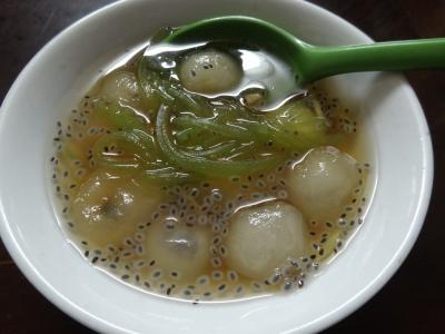 写真を見て気持ち悪いと思われる方も多いと思いますが、デザートとして注文して出てきたものがこれです。カエルの卵のように見えるのがバジルの種で、白いものはブドウを揚げたものらしいです。味は特にしなく、白玉を甘いソースをつけて食べる感じでした。なかなかない体験ができたと思います。