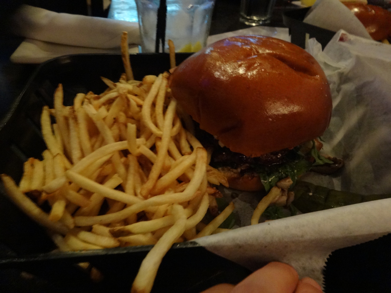 ボリュウムのあるハンバーガーとポテトのセットを注文しました。ハンバーガーは好みに合わせて、チーズや玉ねぎを取り除いて注文することもできるみたいです。おしゃれなバーのようなレストランで、友達8人とゆっくりディナーをしました。詳しくはわかりませんが、現地の友達曰く、このようなレストランではチップを多めに払うらしい…。私たちは、総額の約1割分をクレジットカードで上乗せした代金を払い、さらに20ドル現金をテーブルの上に置きました。