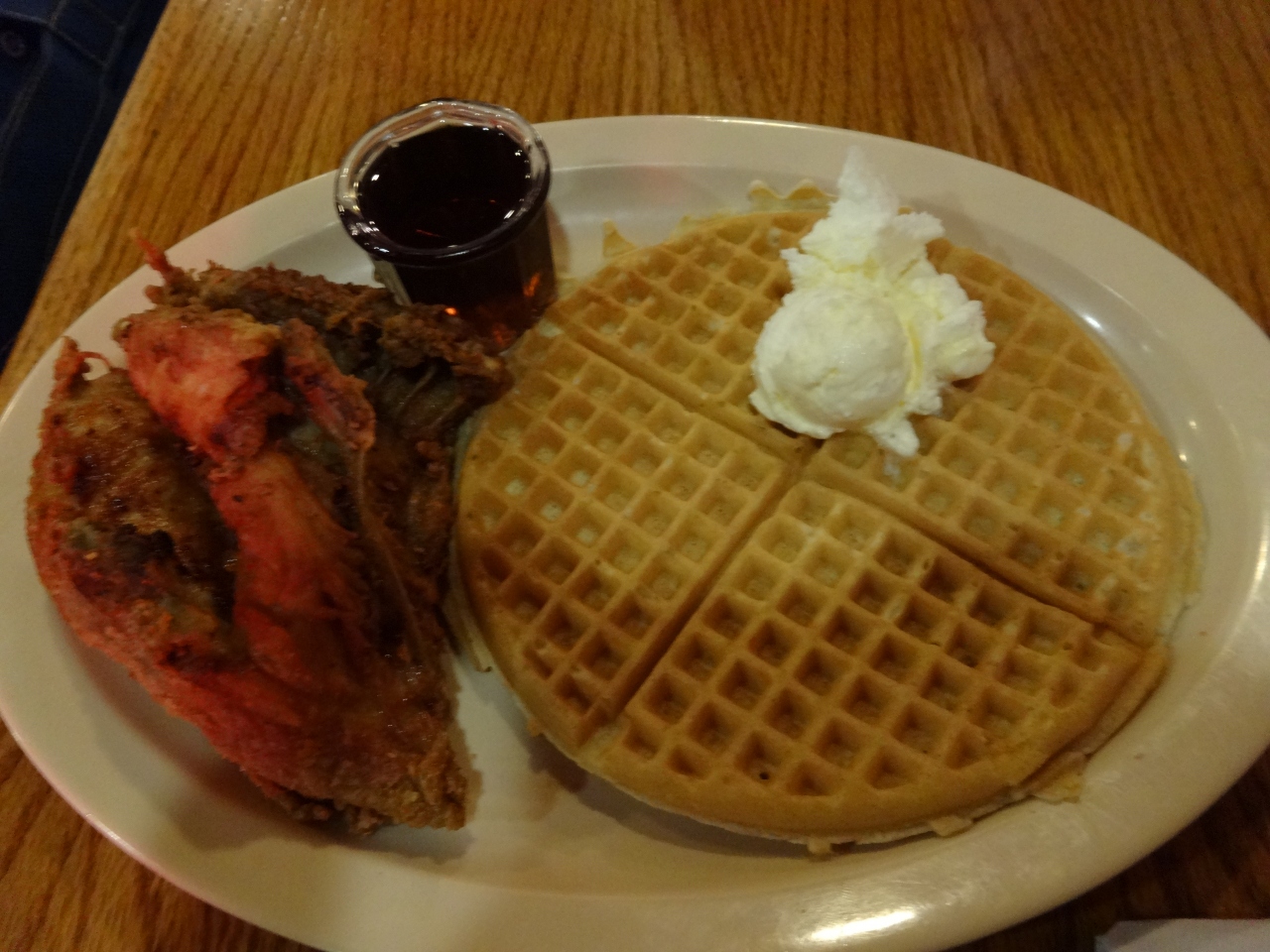 ワッフルと揚げたてチキンにたっぷりのメープルシロップをかけて冷たいアイスと一緒に食べるメニューが、地元の友人の御勧めだったので迷わず注文しました。不思議な組みわせでしたがおいしかったです。最近は日本にも上陸したみたいで嬉しく思います。