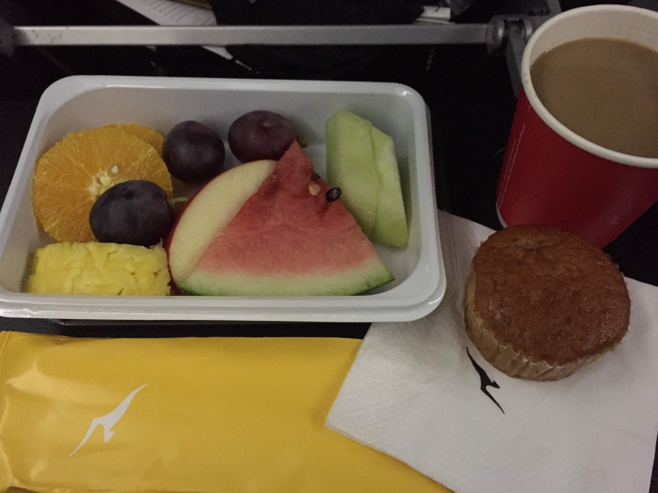 機体は比較的古くて、USBポートがガタガタで、4列シートのどの座席でも充電できませんでした。ご飯はさほど美味しい感じでもなかったです。機体の一番後ろ側の壁に、おやつ用のTimTamとかが大量に並べてあったのが一番よかったですが、これは帰りの飛行機にはありませんでした。