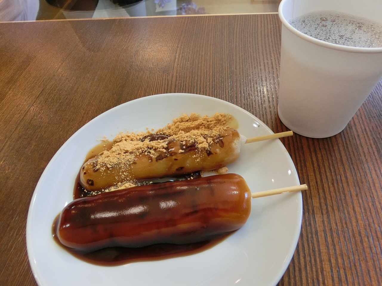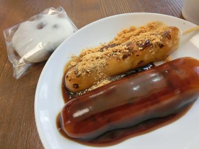 あやめ団子(108円)と、黒蜜きなこ団子(108円)を店内で頂きました。