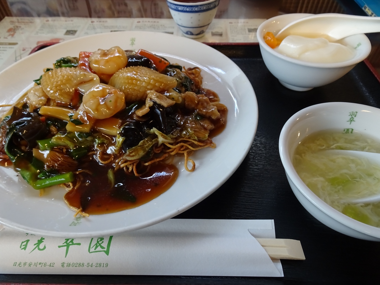 夫は担々麺、わたしは炒麺定食(五目餡かけ焼きそば)を頂きました。