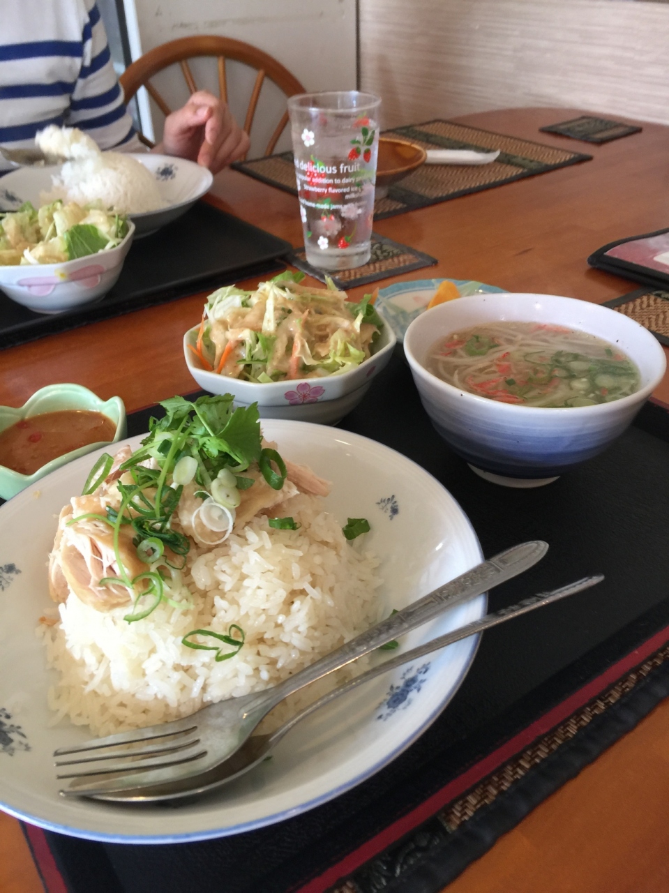定番のカオマンガイセットとトムヤムクンセットと、単品の生春巻きを1本頼んで合計1,910円。お味は本格的なタイ料理。辛い、酸っぱい、そして美味しい!