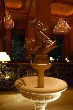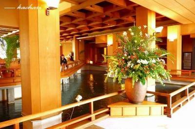 立派な建物から一歩中に入ると、川が流れ大きな生花があしらわれた贅沢な空間のロビーが広がっています。