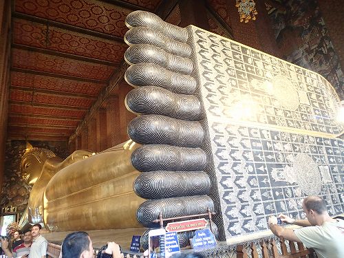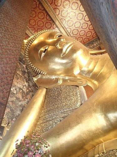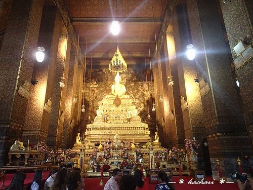 ワットポーと言えばの黄金の寝釈迦仏は、大きすぎてフレームに収まりきらないぐらいの迫力です。半開きの目は、慈悲と悟りの境地を表しているのだそう。柔らかな表情に、思わず釘付けになります。今までこの寝釈迦仏がメインで、ここはそれだけなんだろうと思っていましたが、今回時間があったのでうろうろしつつ本堂に行ってみたら、そこに鎮座していたブロンズ製のご本尊も厳かできらびやかで素晴らしかったです。