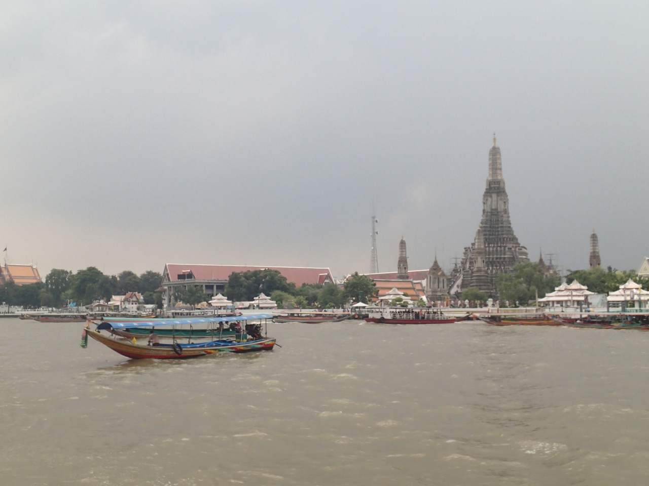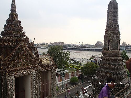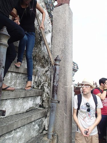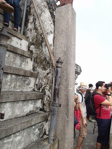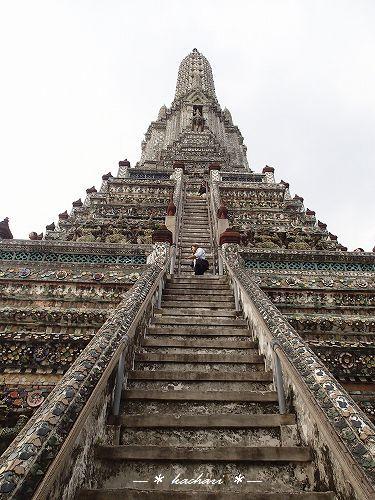 ワットポーから、ちょうどチャオプラヤー川の反対側にあり、渡し船に乗ってすぐです。ボートから眺めるフォルムが本当に美しい仏塔ですが、実際近づくと結構傾斜があります。途中まで上れるのですが、一層目の階段は、急だけどまだまし。二層目の階段は、まさに行きはヨイヨイ・・いや、行きも怖いです。下から見ても90度に近いように見えます。階段の幅も狭いです。昔、何も考えずに上ったら、あまりの怖さに降りれなくなったことがありますが、下りは本当に恐ろしいです。チャレンジャーな方は、帰りの覚悟をしてから上るのをおすすめします!(階段の横から写真を撮ったので載せておきます。)