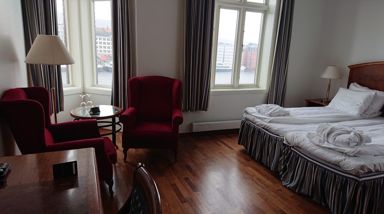 ベルゲン空港から、空港バスに乗り、運転手にホテル名を言うと、終点で降りるようにといわれました。バス停からは、徒歩5分くらいでホテルに着きます。
