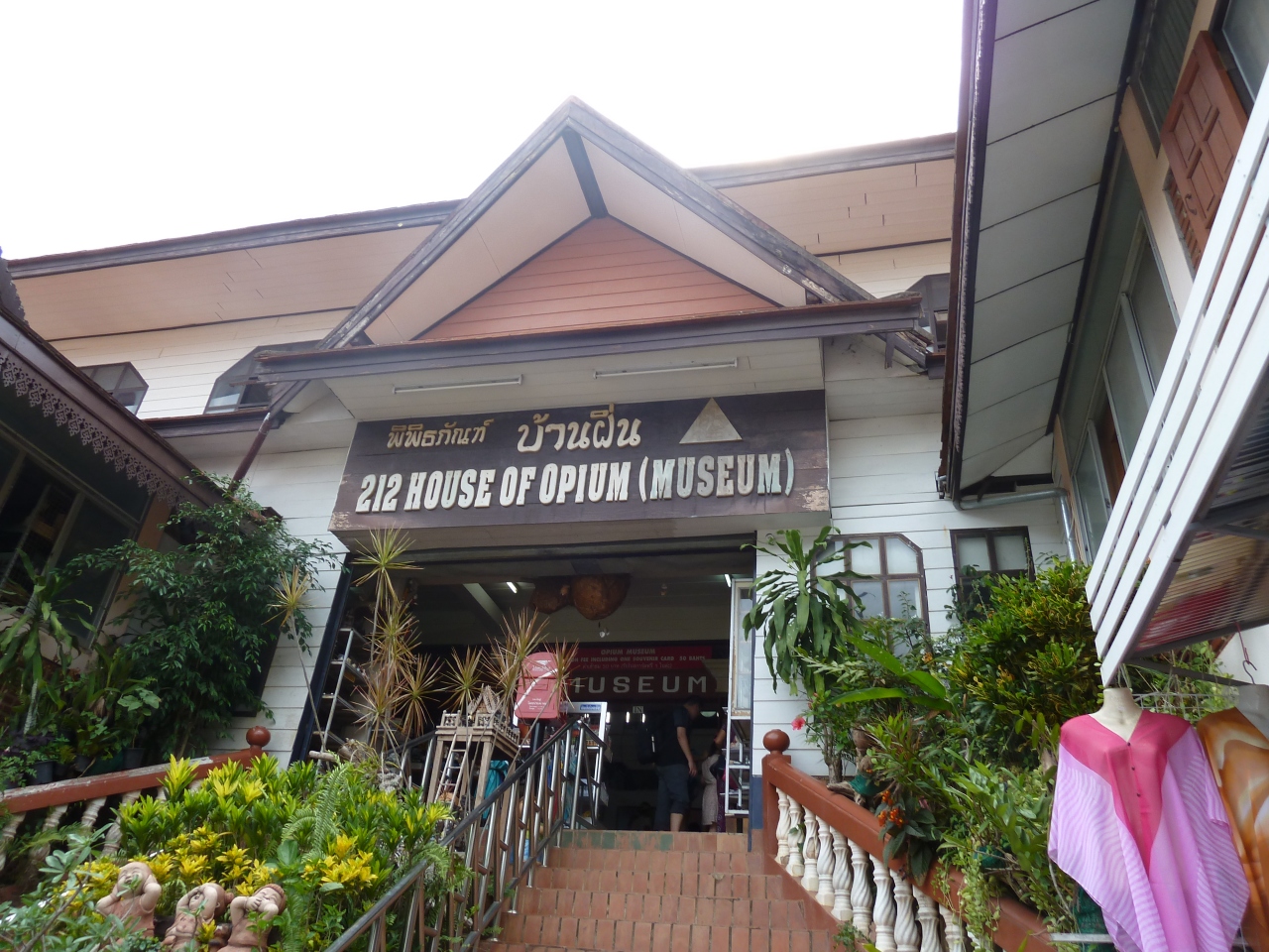 2階建て(実際は3階?)で、1階は、アヘン栽培の歴史と器具の展示、2階は、吸引器具や周辺の部族(首長族)などの紹介の展示をしている。50Bで、入場券がわりに、ポストカードを1枚くれる。基本は、英語での紹介。