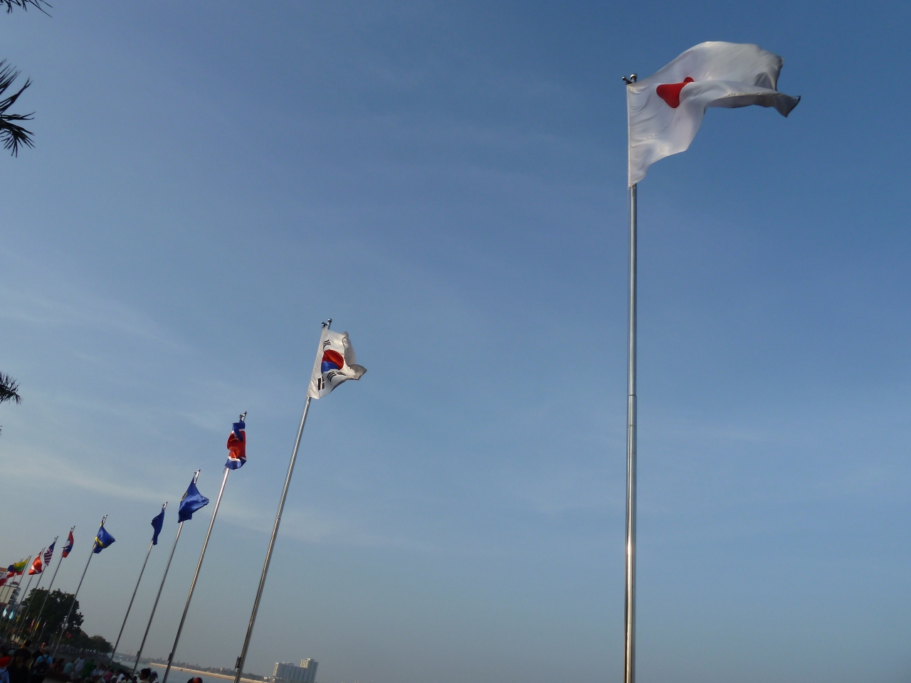 国旗がはためいていて、よくよく見ると、日本の隣は韓国、次は北朝鮮。でも、次は中国でも、ロシアでもない。法則はないようなかんじ。
