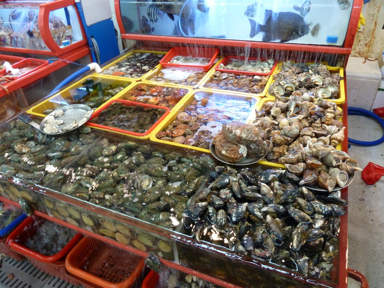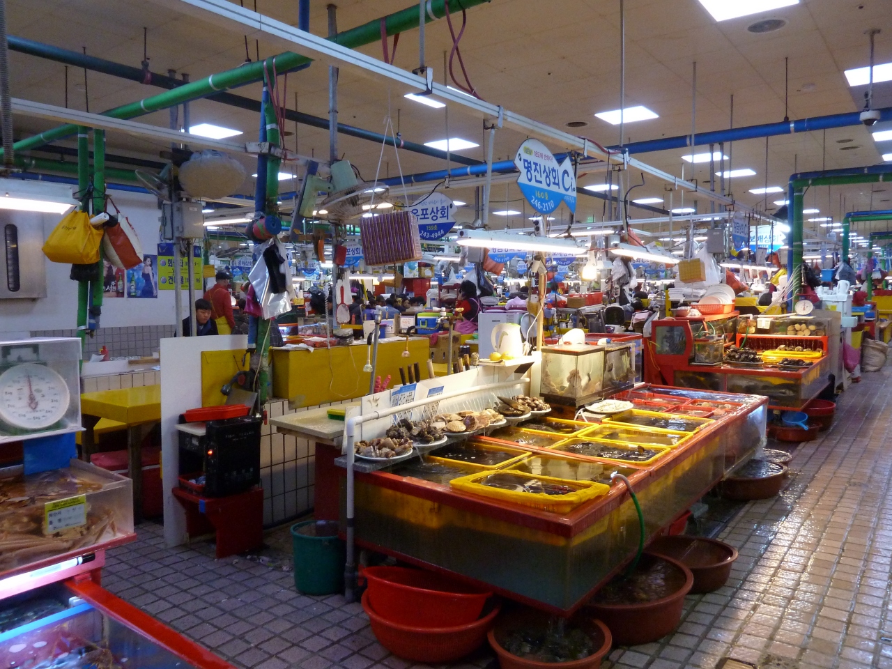 チャガルチ市場のそばにある市場で、生簀から食べたい魚介類を選び調理してもらい食べるシステム。予算を言わないと、とんでもないことになる。食材費プラス調理費と酒代を払うもの。新鮮素材なので、珍しいものを注文するといい。