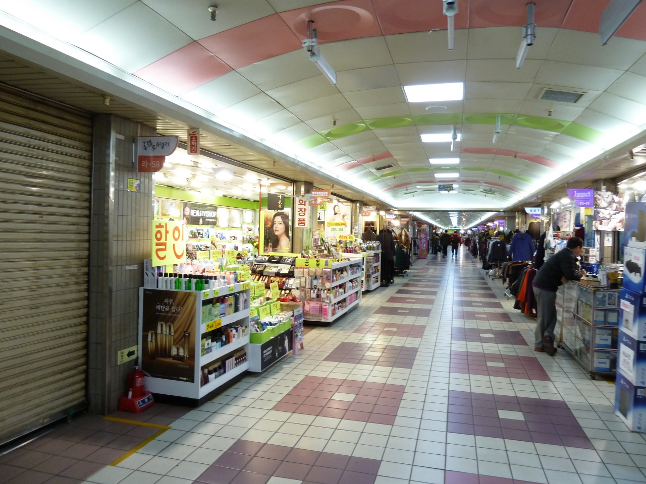 南浦洞からチャガルチ駅の地下に広がるショッピングエリア。洋服や化粧品などいろいろな商品を置いている。約300mくらいにある店。冬、風が強い日は、地下を通ってチャガルチに行くと寒くない。ただ、商品的には、国際市場などと変わり映えしないので、買う意味があるか。どうか。