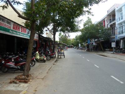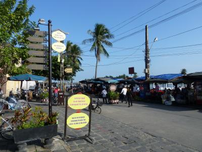 カフェが立ち並ぶ。川や対岸のアンホイ島の風景を見ながら、ぼーっとするには、うってつけのエリア。ホイアン民俗博物館の前の通りである。夜は、キャンドル売りや飲食店でにぎわっている。船着き場には、大きい船・小さい船様々ある。