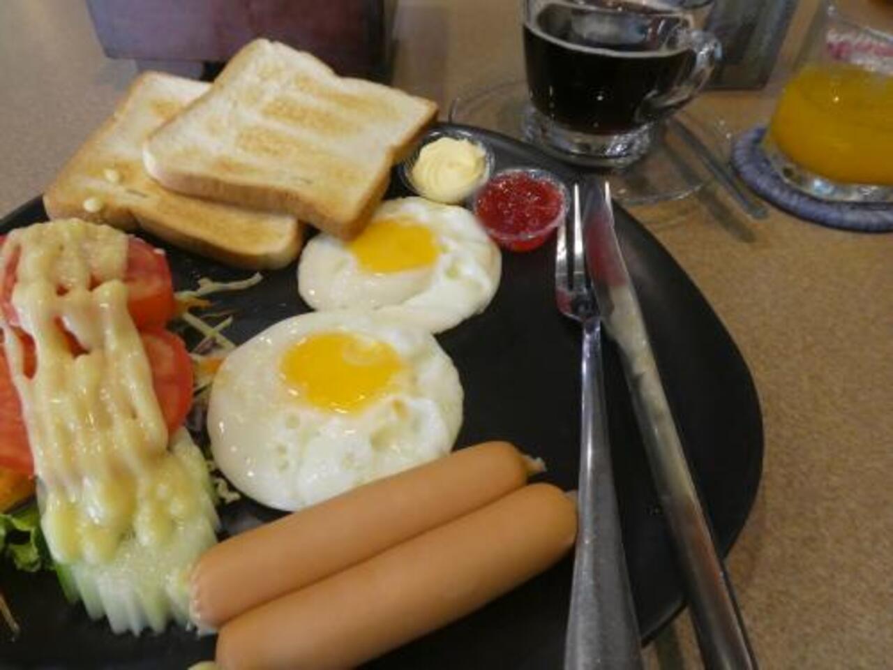 ホテルの朝セットは、パンと料理に飲みもの2種で120バーツ。朝セットの飲みものにコーヒーの選択はあるものの割引はされない。料理自体は美味しく、コーヒーもインスタントではない。- 旅行時期