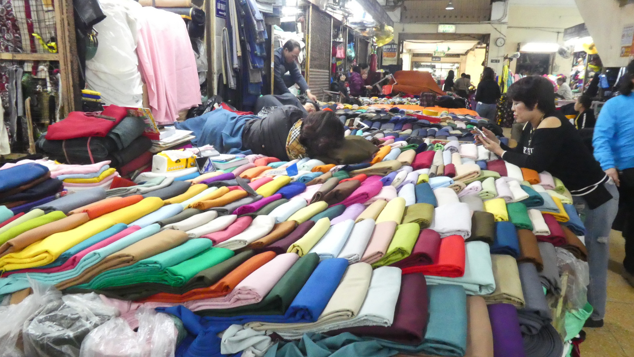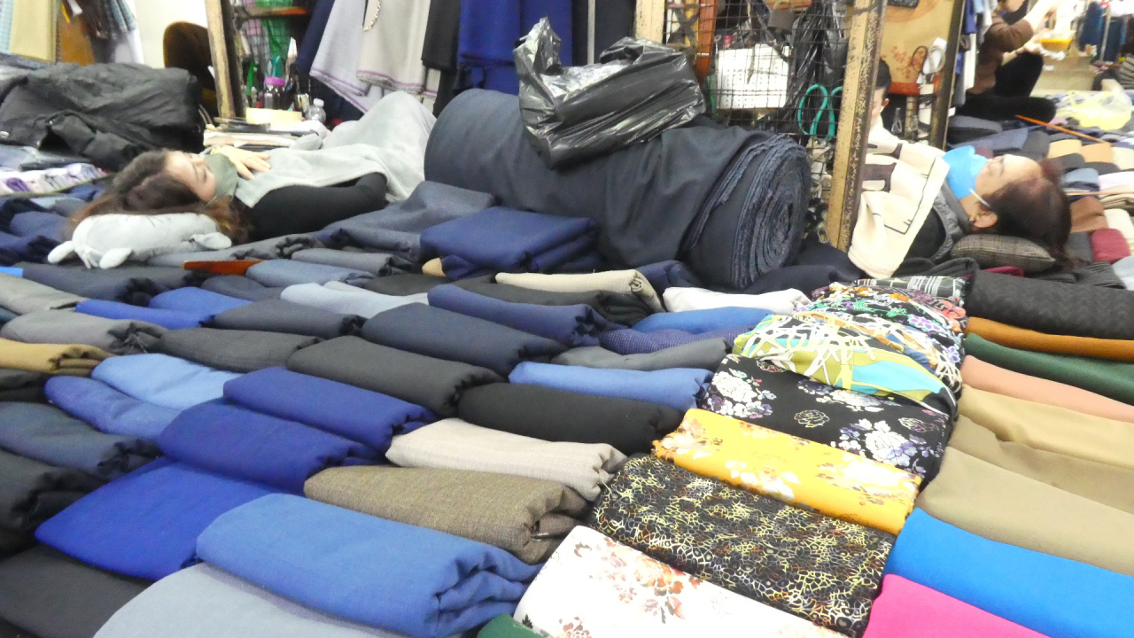 2階は、衣料品がたくさん売っていて、それを見学すると、違和感。反物の中に人が埋もれているというか、寝ているのだ。それも一人ではない。店は違えど、みんな寝ている。
