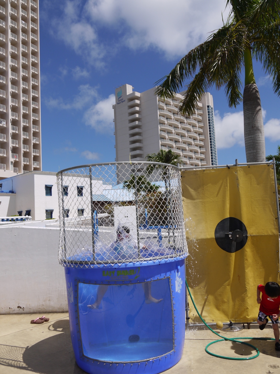 子どもたちが一番喜んだのは、無料参加イベントとして行われていた、ボールを的に当てて水槽の上に座っている相手を水の中に落とす、というゲームです。