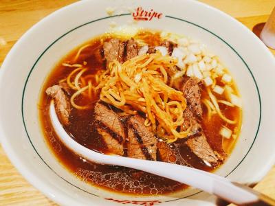 注文したのは「ステーキラーメン」醤油ラーメンの上にどーんとステーキが1枚のっていて、ステーキは別皿の山椒醤油につけて食べることもできます。
