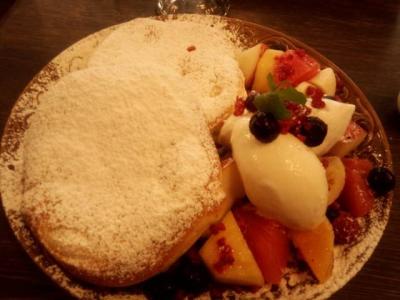 「おいしー」甘すぎないパンケーキとフルーツの甘酸っぱさにメープルがよくあって、ボリュームがありますが、最後まで美味しくいただきました。