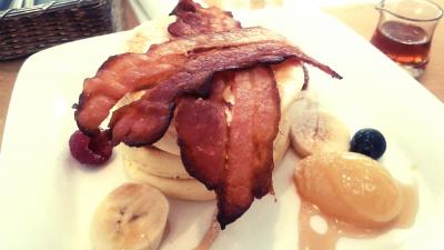 リコッタチーズのパンケーキは、ふわふわだけど、ビルズとはまた違う細やかでしっかりした食感。カリカリのベーコンと蜂蜜バターでいただくとアマジョッパで美味しかったです。天神を歩き疲れた体に優しいパンケーキでした。