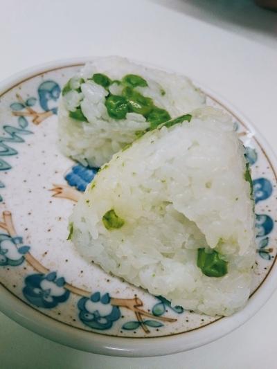 グリンピースおにぎりも懐かしい味。炒飯もいいですが、ラーメンとおにぎりって懐かしい気持ちになりますよね。