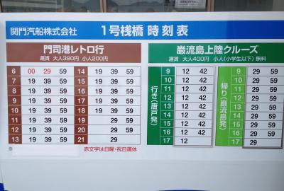 下関と門司港間の関門海峡を5分で結ぶ連絡船。1日で下関と門司港の両方を周ったので、行きは電車、帰りは船を使ってみました。乗り場は、海響館や唐戸市場からすぐ。1時間に3本なので、事前に時間を確認しておいたほうがいいです。