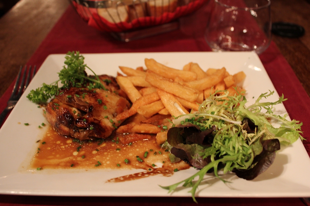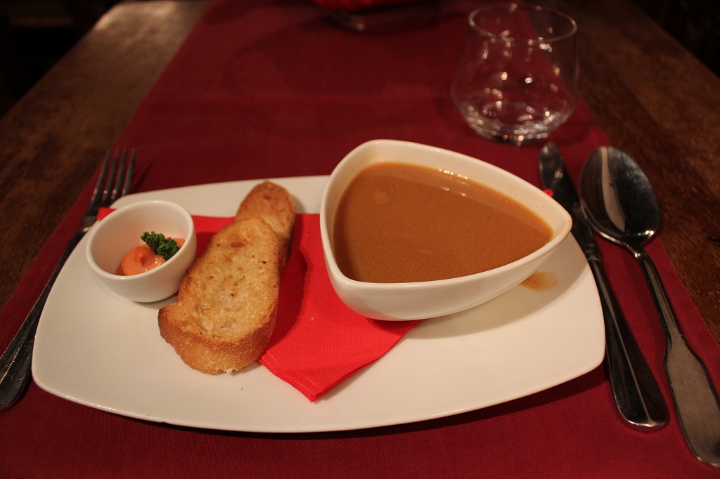 前菜は魚のスープ、メインはローストチキン、