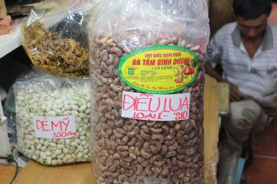 知人に勧められ、ちょうど近くのレストランにランチに行った帰りに寄ってみました。教えられたお店には日本人の先客がいて、その方は、ほかより安いから出張で来るたびにナッツをキロ単位でまとめ買いしているとのこと。私たちも殻付きアーモンドや殻付きカシューナッツをまとめ買いしました。ベンタイン市場よりも安く買えて、100グラムごとに小分けで真空パックしてくれるので、おみやげに配るのも最適です。それにベンタイン市場のように、しつこい客引きもありません。ただ、そのためにタクシー代をかけて行くまでではないと思うので、近くに行くついでがある方にはオススメします。