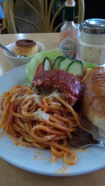 私の定番は、ハンバーグにサラダとナポリタンのポンヌフバーグ。