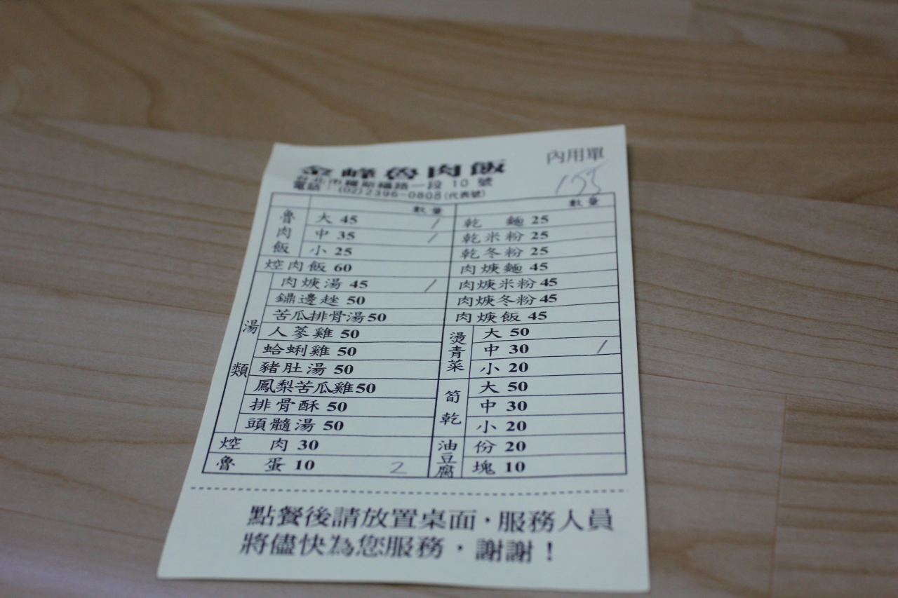 おいしいルーロー飯が食べたくて行きました。自分で伝票に数を書いて注文するので、言葉が通じなくても大丈夫。ルーロー飯のほかに、スープや青菜、煮玉子も注文しましたが、どれもおいしかったです。屋根はありますが、オープンな大衆食堂のような雰囲気なので、落ち着いて食べるという感じではなく、早い!うまい!安い!