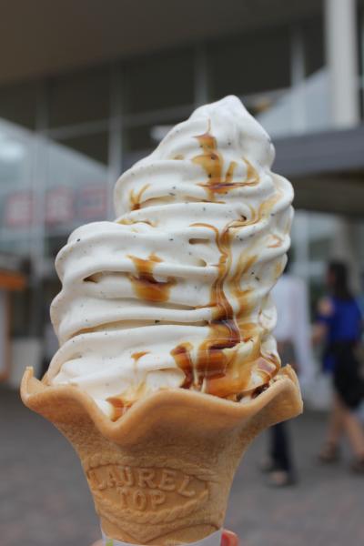 道の駅に立ち寄った際に食べた「信玄ソフトクリーム」。山梨銘菓の信玄餅のように、ソフトクリームにきなこと黒蜜がかかっています。ちょっと甘いですが、和風の味わいでなかなかおいしいです。甘党の方には、オススメします。