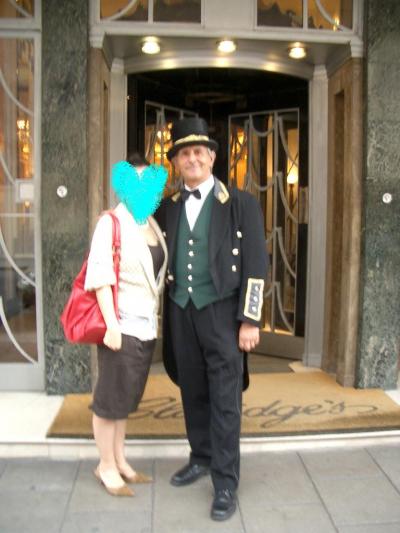 ホテルのエントランスで。