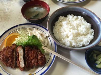 とんかつ定食600円と海老フライライス850円を注文。何故、海老フライ定食と呼ばないのか謎である。