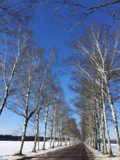 真っ直ぐな未舗装路、両側の白樺、北海道らしい景色、最高です。