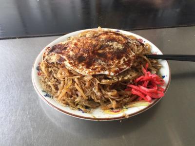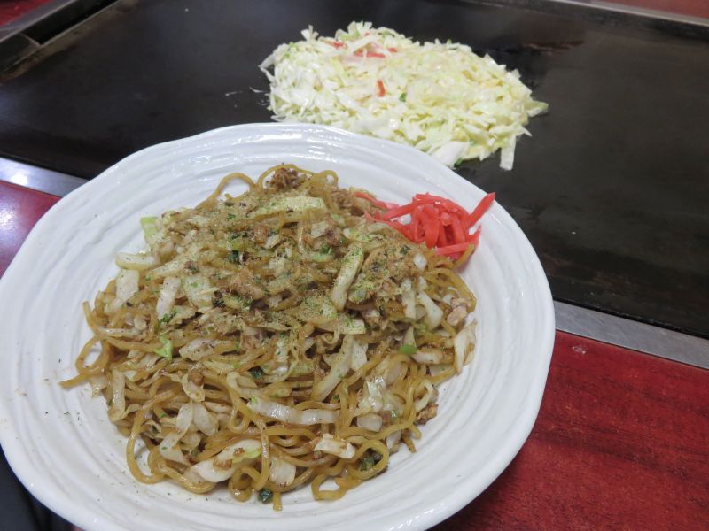 焼きそばとお好み焼きを注文。自分で作ると、味が作り手の調理技能に寄るところが出てくるので、店の人に作って欲しいとお願いすると、焼きそばはOK、お好み焼きは自分で作らなければいけないとのこと。