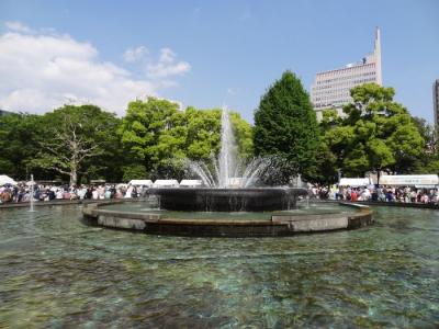 日比谷公園の中心、大噴水。周りの木々、その向うのビル、青い空とのコントラストは見事です。