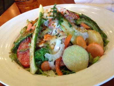色々な野菜が乗っていてすごくヘルシーな感じです。でも、野菜の水分は中央に集まり、ふっくら焼いたハンバーグがその水分を吸ってしまい残念。